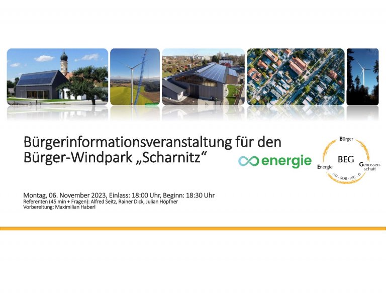 Unterhalb finden Sie die Präsentation zur Bürgerinformationsveranstaltung „Windpark Scharnitz“ vom 06.11.2023.
